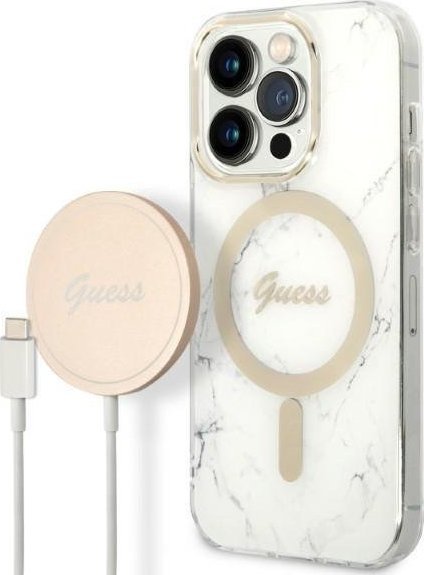 Ładowarka Guess Zestaw Guess etui + ładowarka bezprzewodowa GUBPP14XHMEACSH Apple iPhone 14 Pro Max biały/white hard case Marble MagSafe