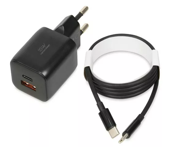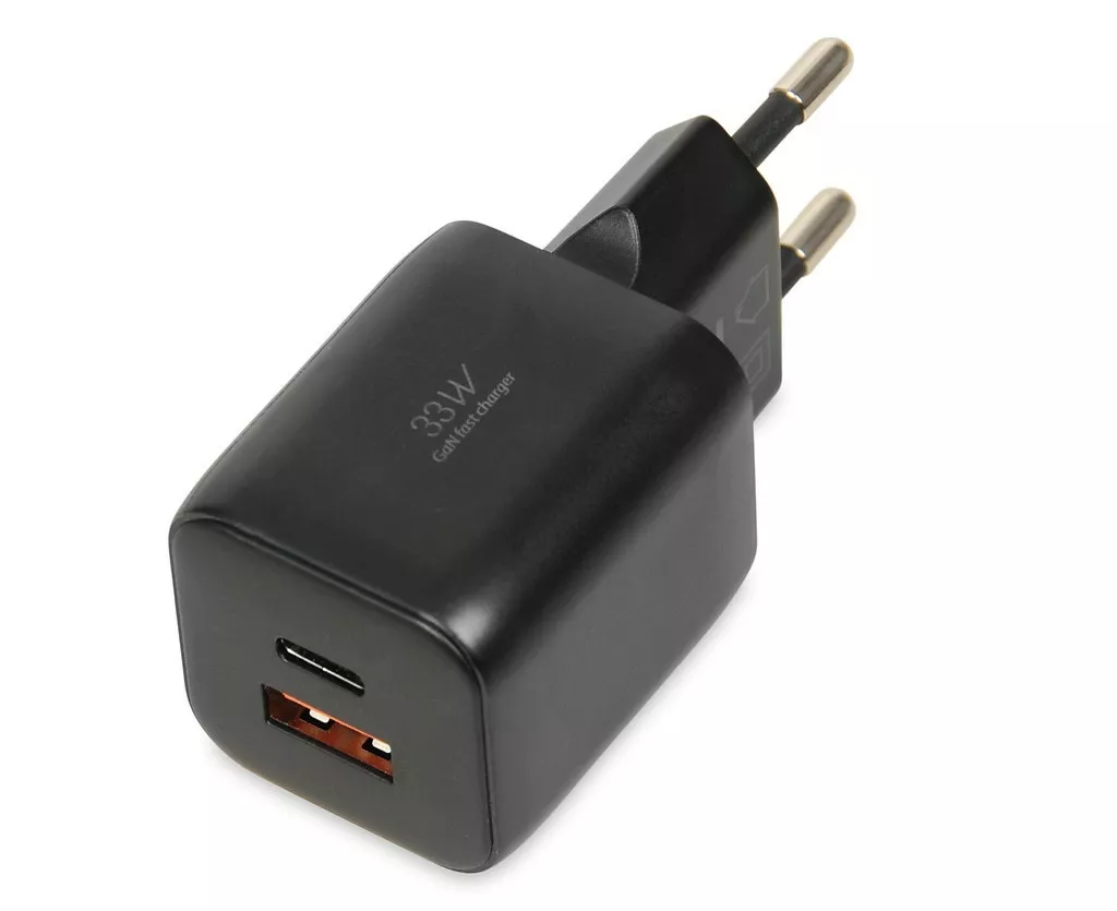 Moc 33W w kompaktowej ładowarce. Wykonana w technologii GaN, dziękiczemu nie grzeje się w czasie pracy. Wyposażona jest w port USB-C oraz port USB-A. Ładowarka wspiera wiele standardów ładowania dzięki czemu można sprawnie naładować urządzenia różnych producentów.