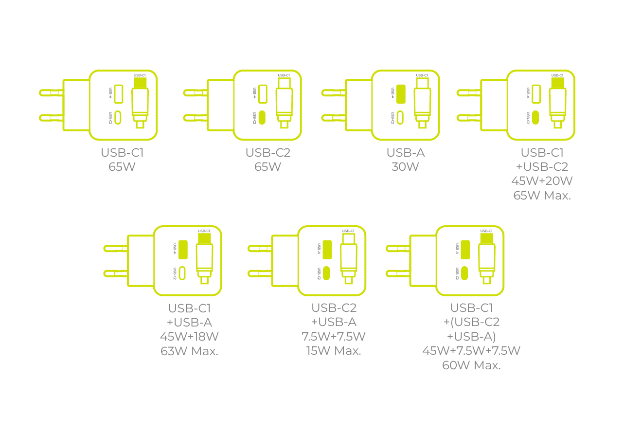 - USB-C1 + (USB-C2 + USB-A): 45 W + 15 W (maks. 60 W)