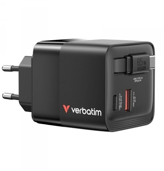 Ładowarka ścienna Verbatim GaN 65W 1xUSB-C PD 3.0 1xUSB-A QC 3.0 z kablem USB-C PD 65W