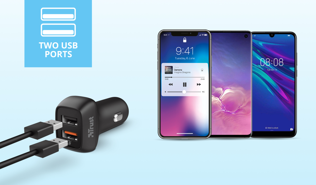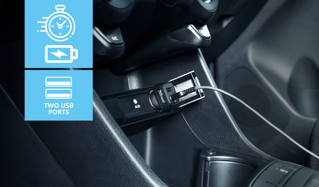 Dzięki dwóm portom USB, Trust Qmax Ultra-Fast Car Charger to potężna wielozadaniowość na drodze. Zapewni maksymalną moc Twoim urządzeniom: w ciągu zaledwie 30 minut bateria telefonu wróci do 50%. A dzięki dwóm portom możliwe jest jednoczesne ładowanie dwóch urządzeń.