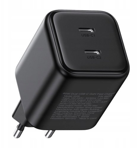 Ładowarka UGREEN Dual USB-C 45W X526 w eleganckim czarnym kolorze to nowoczesne rozwiązanie, które łączy w sobie zarówno wydajność, jak i mobilność. Dzięki technologii Power Delivery oraz innowacyjnemu chipowi Crystal GaN, ta ładowarka potrafi dostarczyć moc do 45W, co czyni ją doskonałym wyborem do szybkiego ładowania laptopów, smartfonów oraz tabletów.