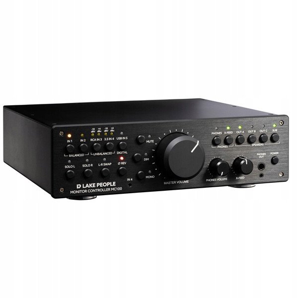 Lake People MC100 oferuje różnorodne wejścia, w tym dwa zbalansowane wejścia XLR, niezbalansowane wejście RCA oraz wejście USB obsługujące sygnały PCM do 384 kHz / 32 bit i DSD256. Wyjścia obejmują zbalansowane gniazda XLR oraz wyjścia słuchawkowe w formatach 1/4” i 3,5 mm, co sprawia, że kontroler jest wszechstronny i dostosowany do różnych zastosowań audio.