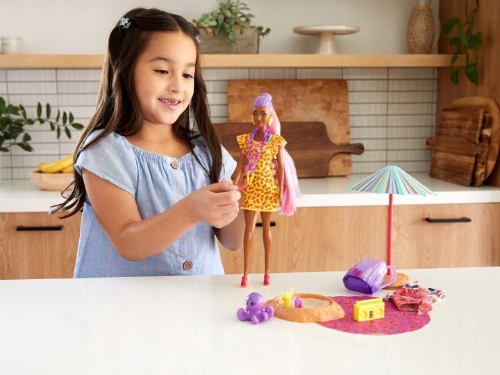 Te zestawy Barbie Color Reveal Pachnąca piana kryją mnóstwo niespodzianek – w tym sensorycznych W każdym z nich jest lalka, ale jej wygląd pozostaje na razie tajemnicą. Wlej do tubki dołączony zapachowy płyn i potrząśnij. Wytworzy się piana, a Ty odkryjesz wygląd lalki! Opakowanie jest częścią zabawy – znajdziesz tam basen dla lalki i inne niespodzianki. W asortymecie są trzy motywy do – truskawka, arbuz i ananas. W każdym zestawie jest 1 lalka, 1 figurka zwierzątka, 2 stylizacje, piasek do formowania, akcesorium do noszenia i nie tylko. Do przechowywania akcesoriów użyj tubki z zestawu.
