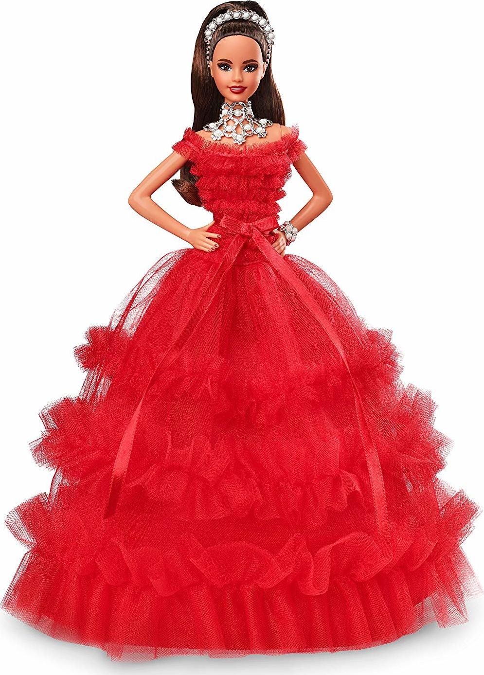 Świąteczna lalka Barbie ™nosi piękną czerwoną suknię. Wyrafinowane akcesoria - opaska, naszyjnik i bransoletka z perłami.