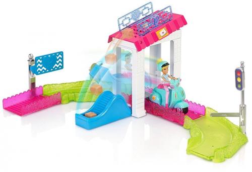 Mała lalka Barbie® ma ruchome biodra i kolana, dzięki którym może siedzieć na swoim skuterze, a także ruszającą się główkę, która dodaje przygodzie realizmu. Aby rozpocząć zabawę, naciśnij tablicę rejestracyjną z napisem „Barbie®”, która znajduje się z tyłu skutera. Zasilany baterią silniczek zacznie pracować, a skuter ruszy.