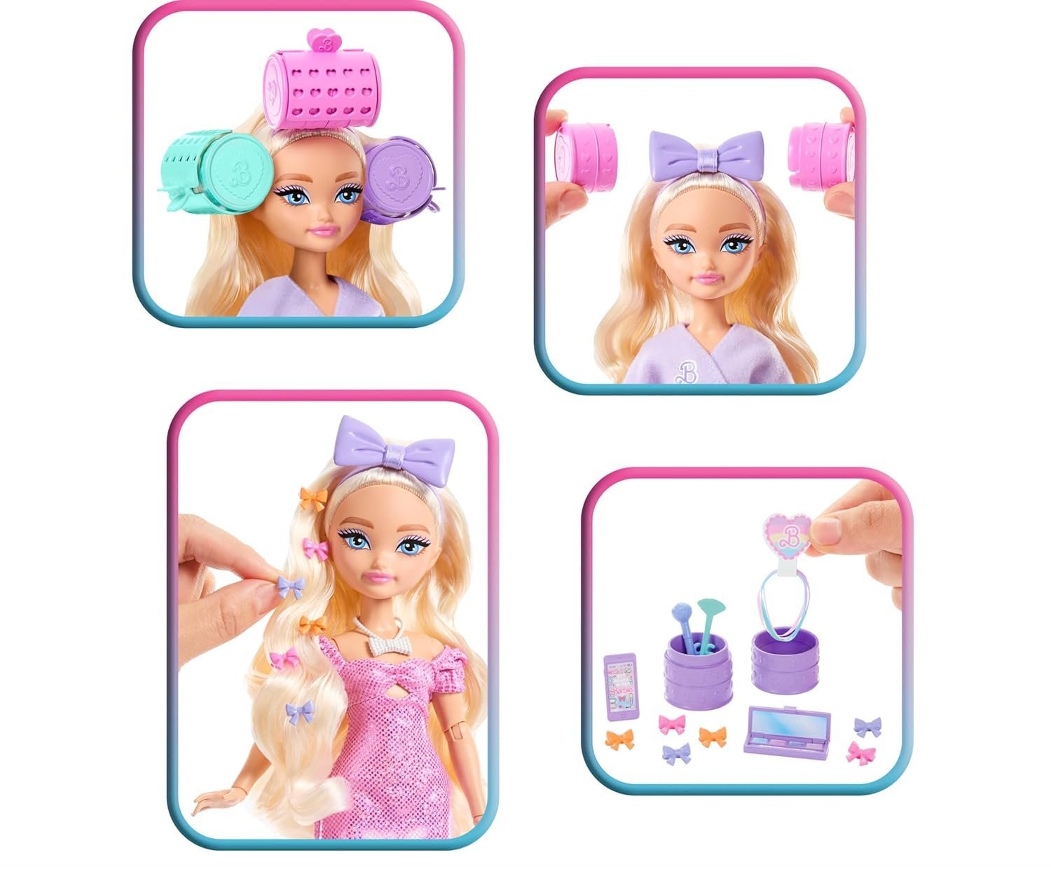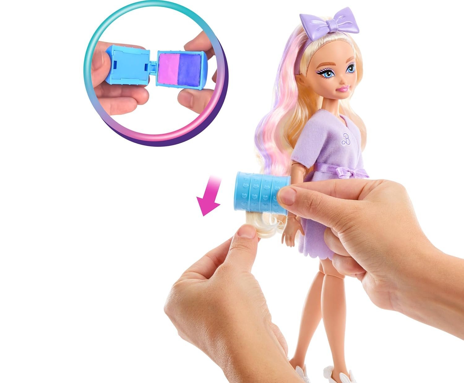 Długie włosy Barbie oferują niekończące się możliwości układania fryzur. Otwórz urocze pojemniczki w kształcie wałków, by odkryć akcesoria, takie jak kolorowa kreda do włosów, którą można tworzyć modne pasemka. Użyj dołączonych spinek, dużej kokardy i gumek, aby stworzyć unikalne upięcia. Zestaw zawiera również biżuterię, w tym naszyjnik, który dopełni wieczorową kreację. Dzięki ruchomym przegubom w ramionach, łokciach, biodrach i kolanach, lalka może przybierać realistyczne pozy – siedzieć przed lustrem, trzymać telefon czy poprawiać makijaż.