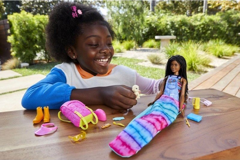 Zabierz lalkę Barbie Brooklyn na niesamowitą wyprawę kempingową ze szczeniaczkiem i ponad 10 akcesoriami biwakowymi, które inspirują do wymyślania różnorodnych opowieści. Chcesz odkrywać leśne ostępy? Przypnij śpiwór Barbie i zapakuj do plecaka niezbędne akcesoria do pieszych wędrówek, takie jak latarka, aparat, książka i nie tylko. Po całym dniu przygód okryj lalkę Barbie i jej szczeniaczka przytulnym śpiworem do snu pod gwiazdami.