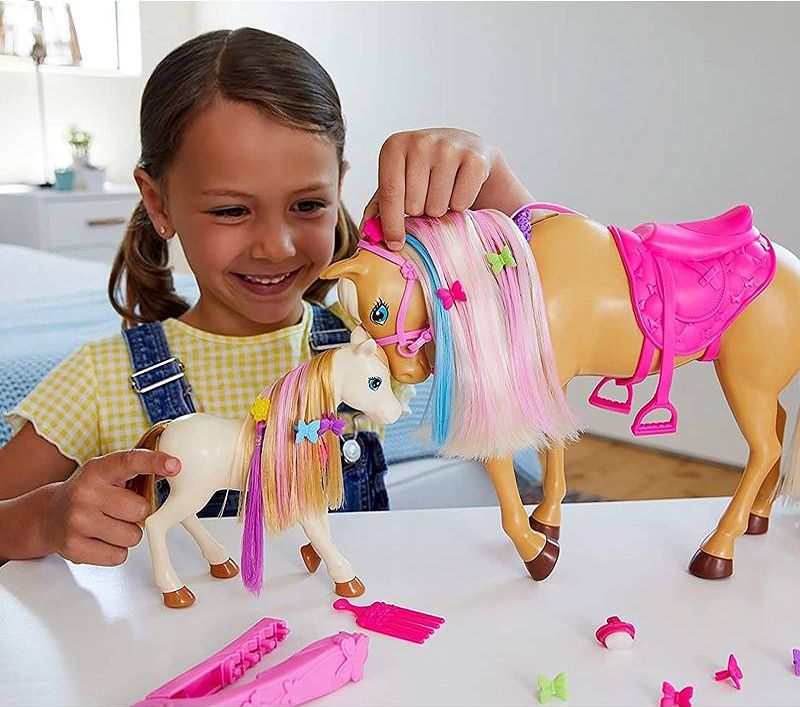 • Zestaw do zabawy Barbie Koniki Stylizacja i opieka z lalką Barbie, 2 figurkami koni i ponad 20 akcesoriami tematycznymi to wymarzony prezent dla każdego miłośnika zwierząt.