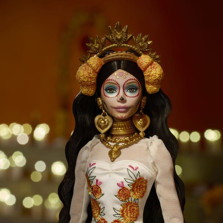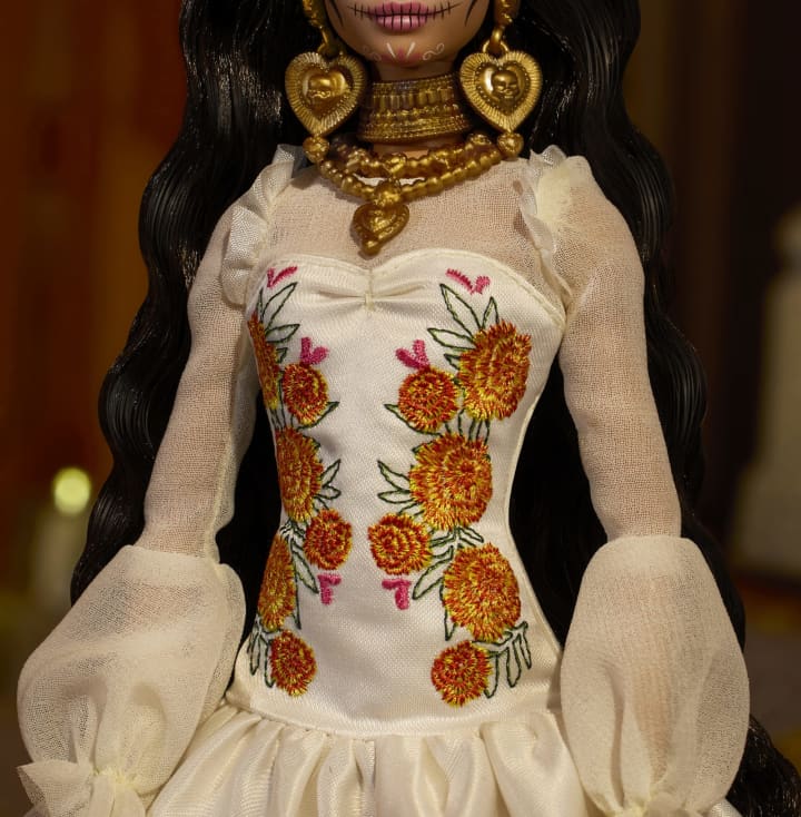 Kreacja lalki została w całości zainspirowana kwiatem aksamitki (hiszp. cempasúchil), który w kulturze Meksyku symbolizuje więź między światem żywych i umarłych oraz służy do dekorowania ołtarzy i grobów. Kwiaty te, oznaczające ciepłe powitanie, zdobią gorset i rąbek sukni. Korona z aksamitek wpleciona we włosy lalki dodatkowo podkreśla jej piękny makijaż czaszki.