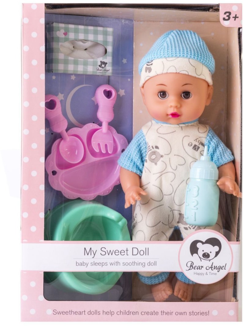Uroczy bobas, który pije z butelki i siusia do nocnika. Dodatkową atrakcją są 6 funkcji dźwiękowych, dzięki którym zabawa lalą jest jeszcze przyjemniejsza. W skład zestawu wchodzi lalka o wysokości około 30 cm, ubrana w mięciutkie dzianinowe ubranko w kolorze biało-niebieskim oraz akcesoria: