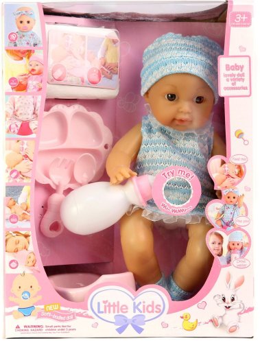 Uroczy bobas, który pije z butelki i siusia do nocnika. Dodatkową atrakcją są 4 funkcje dźwiękowe, dzięki którym zabawa lalą jest jeszcze przyjemniejsza. W skład zestawu wchodzi lalka o wysokości około 30 cm, ubrana w mięciutkie dzianinowe ubranko w kolorze niebieskim oraz akcesoria: