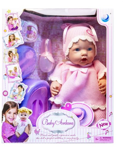 Uroczy bobas, który pije z butelki i siusia do nocnika. W skład zestawu wchodzi lalka o wysokości około 40 cm, ubrana w mięciutkie dzianinowe ubranko w kolorze różowym oraz 5 akcesoriów: