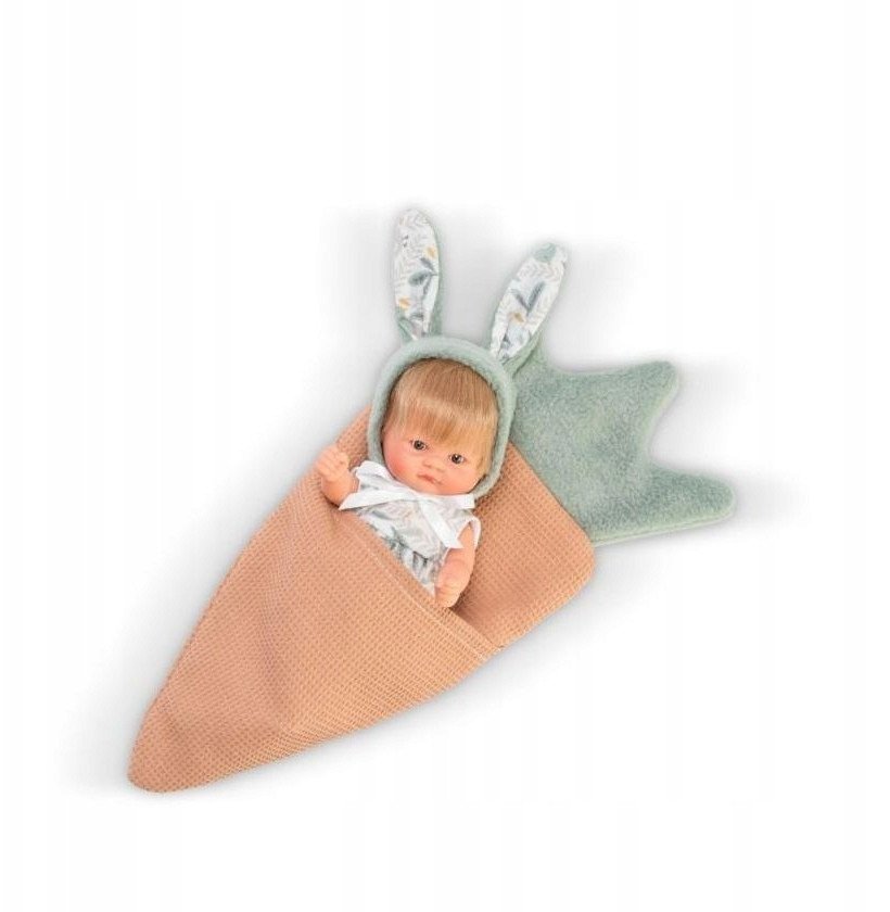Lalka ma krótkie blond włosy oraz uroczy strój składający się z bawełnianego wzorzystego rampersa i polarowej czapeczki z króliczymi uszami. Taki design sprawia, że lalka jest nie tylko atrakcyjna wizualnie, ale także idealna do przebierania w różne stylizacje.