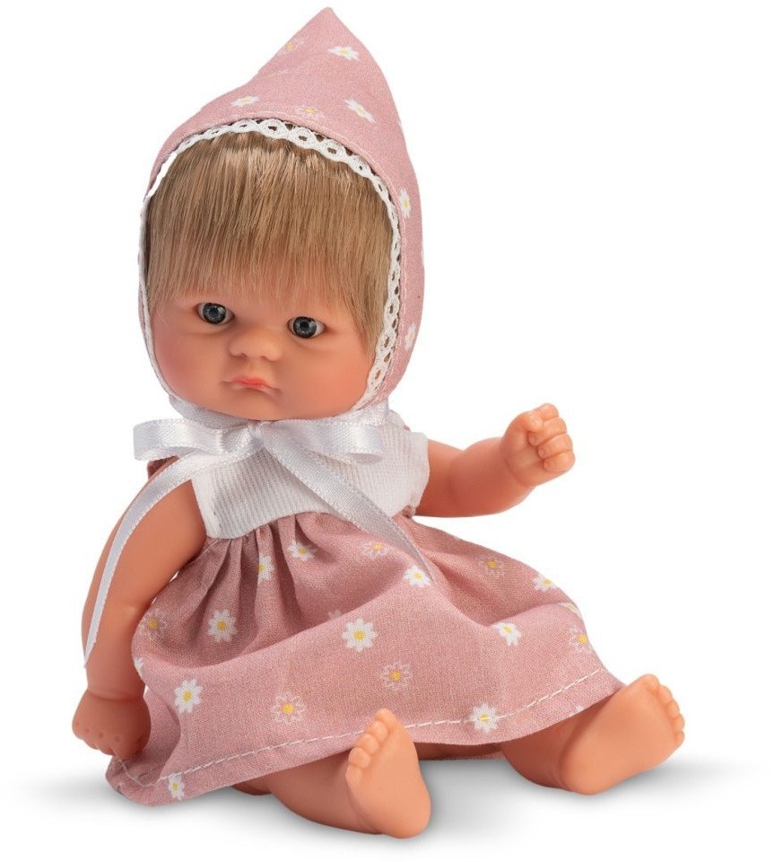 Model Bomboncin wyróżnia się nie tylko estetyką, ale również dbałością o detale. Ręcznie szyty strój w biało-pudrowe rumianki oraz ozdobna czapeczka z satynową wstążką nadają jej wyjątkowy urok. Krótkie blond włosy i wyraz twarzy sprawiają, że lalka przypomina prawdziwe dziecko.