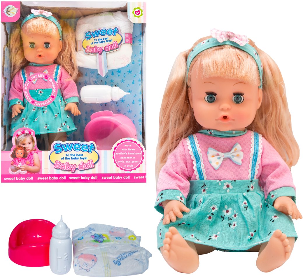Lalka w zielonej sukience z 3 akcesoriami - mówi, śmieje się i siusia