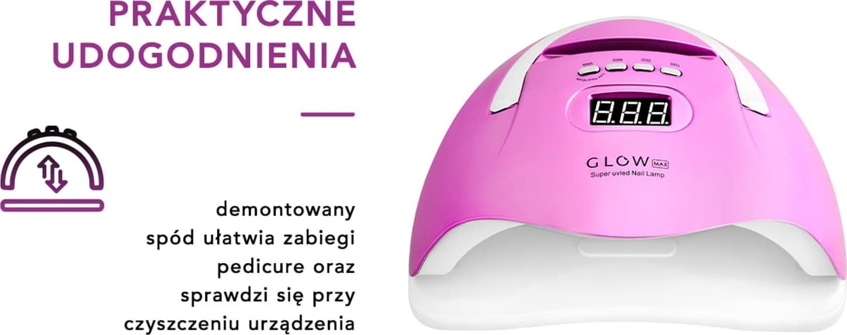 Przydatne funkcje, ergonomiczny kształt oraz wyjątkowy design z lustrzanym, metalicznym wykończeniem w odcieniach różu sprawiają, że lampa jest praktycznym, a zarazem niezwykle gustownym elementem wyposażenia salonu. Odpowiednie wymiary pozwalają na komfortowe ułożenie całej dłoni czy stopy pod lampą, co zapewnia równomierne utwardzanie stylizacji.