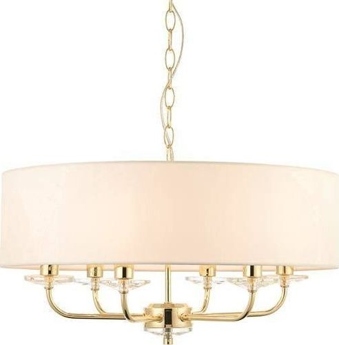 Lampa wisząca sufitowa Nixon 6 light jest wykończona płytą z efektem mosiądzu. Ramiona są uzupełnione odrobiną kryształu, a oprawa jest zwieńczona wąskim, białym, sztucznym jedwabnym kloszem w stylu vintage. Wysokość można regulować, a oprawa jest ściemniana i nadaje się do użytku z lampami LED. Dostępne pasujące elementy