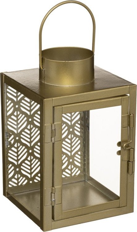 Ozdobny lampion o podstawie kwadratu, z ażurową jedną ścianką. Wykonany z metalu w kolorze złotym. Wyposażony w uchwyt do przenoszenia i rygielek do zamykania drzwiczek.