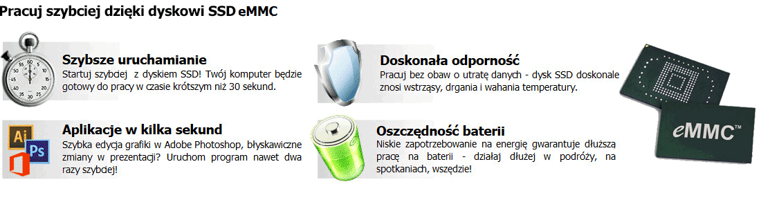 Nowoczesny, szybki i niezawodny dysk SSD doda Twojemu urządzeniu kolejny atut. Jeśli cenisz błyskawiczne działanie, wymagające gry komputerowe, pracę na wielu plikach i programach – dysk SSD sprawdzi się niezawodnie. Laptopy z dyskiem SSD pracują ciszej, a Twoje dane są jeszcze lepiej chronione – nośnik jest odporny na uszkodzenia mechaniczne i energooszczędny, co przekłada się na długość pracy Twojego laptopa na baterii.