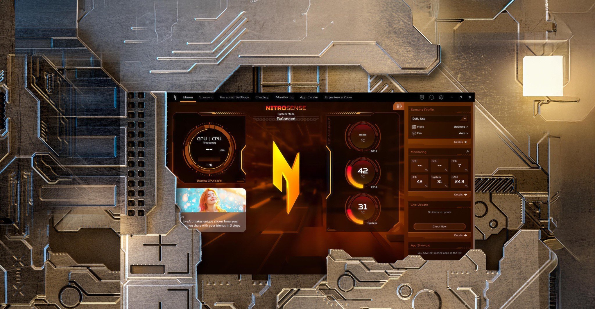 Zarządzaj wydajnością i środowiskiem pracy w czasie rzeczywistym z pomocą narzędzi opartych na sztucznej inteligencji: NitroSense™ i Experience Zone pozwalają na dostosowanie chłodzenia, podświetlenia, a nawet stylu pracy komputera. Acer ProCam wspomaga wideorozmowy dzięki automatycznemu kadrowaniu i korekcji spojrzenia, a Acer TNR poprawia jakość obrazu przy słabym oświetleniu. Wszystko po to, byś miał pełną kontrolę – w grze i poza nią.
