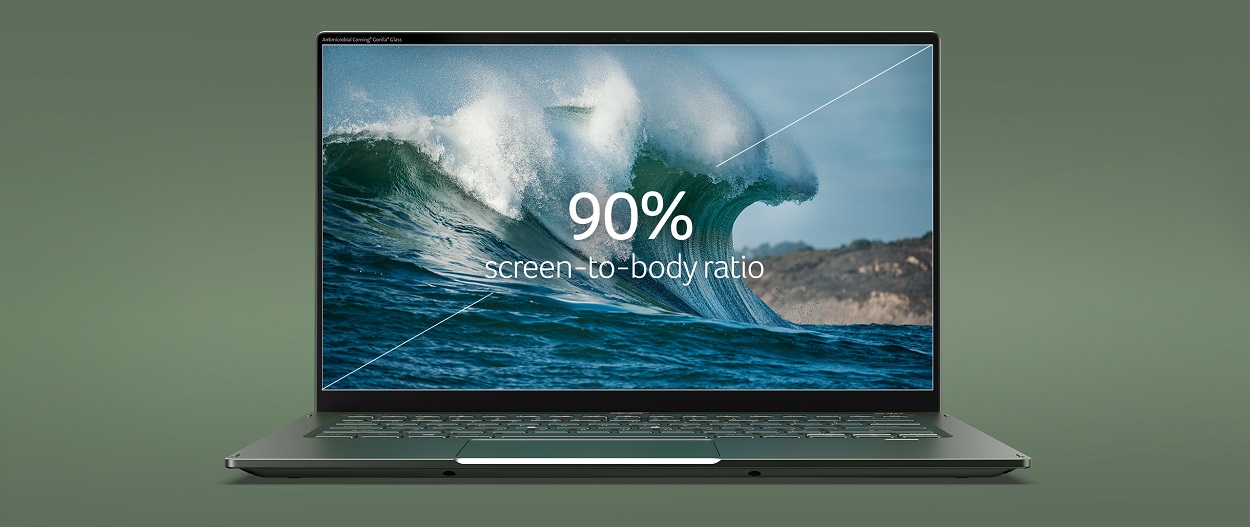 Ekran wykonany w technologii IPS ma wielkość 14 cali i wyświetla obraz w jakości Full HD. Tafla z wytrzymałego szkła Corning® Gorilla® Glass z pełni także funkcję ekranu dotykowego. Jasność wyświetlanych obrazów osiąga poziom 340 nitów, a rozpiętość kolorystyczna zachwyca dzięki pokryciu gamy sRGB na poziomie 100%. Dodatkowym atutem tego ekranu jest wąska ramka, która sprawia, że zajmuje on aż 90% powierzchni górnej obudowy.