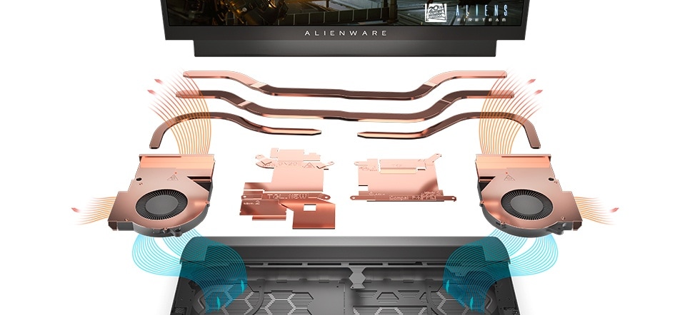 Idealny przepływ powietrza: dwa wentylatory umieszczone w nowej obudowie notebooka m15 R6 pobierają chłodne powietrze z górnego i dolnego otworu wentylacyjnego, a następnie odprowadzają ciepło lewym, prawym i tylnym otworem wentylacyjnym w celu optymalnego chłodzenia podstawowych podzespołów.