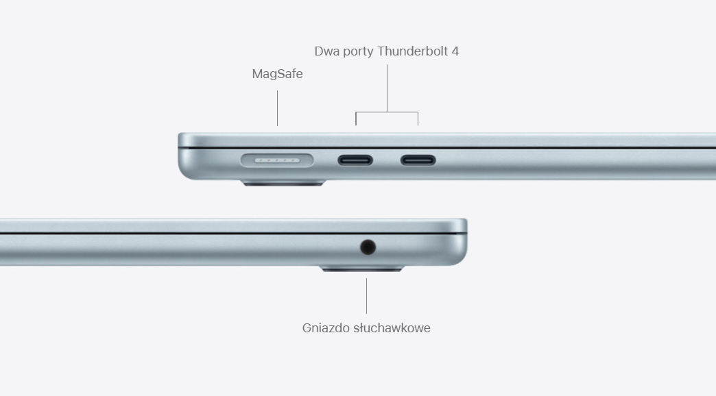 Obudowa MacBooka Air wykonana jest w 100 procentach z aluminium pochodzącego z recyklingu, co łączy dbałość o ekologię z najwyższą trwałością. Laptop jest niezwykle smukły i waży zaledwie 1,23 kg, dzięki czemu z łatwością zmieści się w każdym plecaku czy torbie. Solidna konstrukcja sprawia, że jest gotowy na trudy codziennego użytkowania w różnych warunkach. Całość dopełnia elegancka kolorystyka, która nadaje urządzeniu nowoczesnego i profesjonalnego wyglądu.