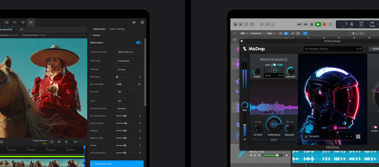 Podkręcaj wokale za pomocą wtyczek AI, takich jak MicDrop w Logic Pro. I w mgnieniu oka dogłębnie modyfikuj obrazy z funkcją Wypełnienie generatywne w Adobe Photoshop.