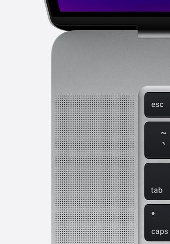 MacBook Pro brzmi teraz naprawdę potężnie. Sześciogłośnikowy system audio wypełnia przestrzeń dźwiękiem stereo, jakim nie mógł się pochwalić jeszcze żaden notebook. Dwa głośniki niskotonowe w technologii force‑cancelling radykalnie redukują wibracje, umożliwiając odtwarzanie basów głębszych o całe pół oktawy. Wszystkie dźwięki są czystsze i brzmią dużo naturalniej. A jeśli chodzi o rejestrowanie podcastów czy nagrywanie muzyki w trasie, układ trzech mikrofonów klasy studyjnej w MacBooku Pro może śmiało konkurować z profesjonalnymi mikrofonami innych firm.