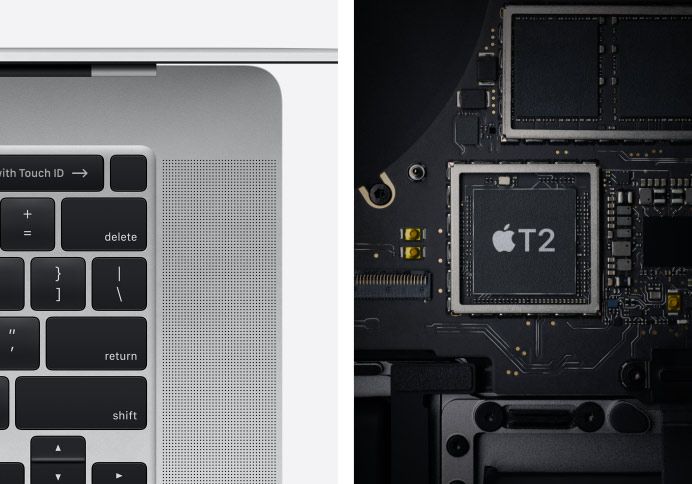 Każdy MacBook Pro wykorzystuje czip Apple T2 Security – zaprojektowany przez Apple specjalnie dla komputerów Mac układ drugiej generacji, dzięki któremu sprzęt jest jeszcze lepiej zabezpieczony. Czip zawiera koprocesor Secure Enclave umożliwiający działanie Touch ID i będący fundamentem bezpiecznego uruchamiania systemu oraz szyfrowania pamięci masowej. Jeden czip Apple T2 Security zastępuje także szereg odrębnych kontrolerów, w tym dotychczasowy układ SMC (System Management Controller), kontroler audio i kontroler pamięci masowej SSD.