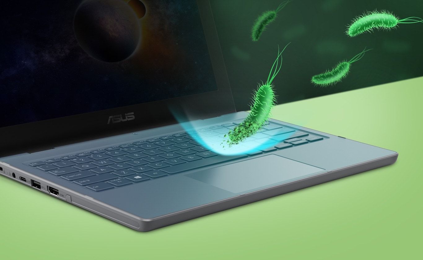 Na powierzchni każdego laptopa znajdują się tysiące potencjalnie szkodliwych bakterii. Aby zapewnić higienę ASUS BR1100C, klawiatura, touchpad i podpórka pod nadgarstki są pokryte powłoką antybakteryjną. Hamowanie wzrostu bakterii o ponad 99% przez okres 24 godzin zostało naukowo udowodnione przez uznaną na całym świecie normę ISO 22196. ASUS Antibacterial Guard jest również odporna na środki czyszczące na bazie alkoholu i wodę z kwasem podchlorawym7, umożliwiając utrzymanie powierzchni laptopa w czystości i higienie oraz ograniczając rozprzestrzenianie się szkodliwych bakterii.