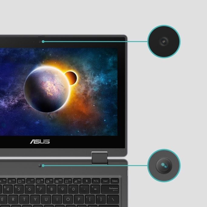 ASUS BR1100F jest wyposażony w dwie kamery: jedną standardową kamerę internetową oraz specjalną kamerę o wysokiej rozdzielczości skierowaną na świat zewnętrzny, która znajduje się tuż ponad klawiaturą – czyli w idealnym miejscu ułatwiającym trzymanie urządzenia w orientacji pionowej.