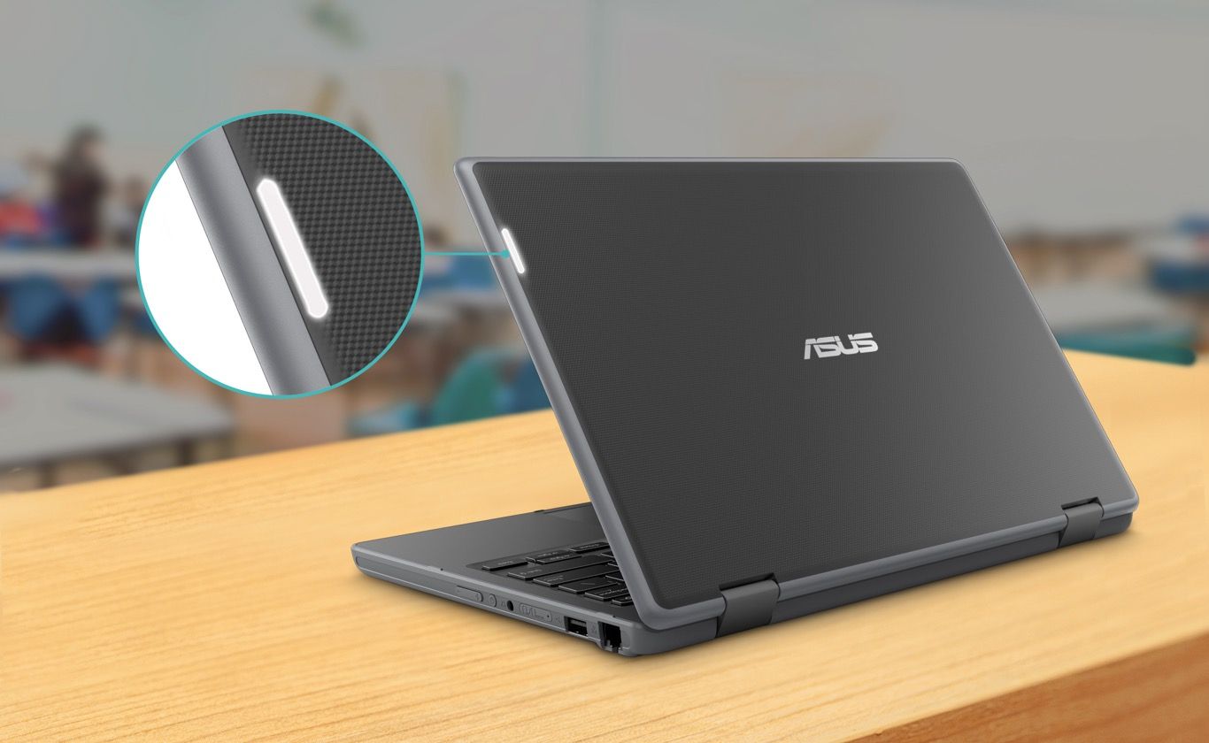 ASUS BR1100F dysponuje jasną kontrolką LED wskazującą prawidłowe działanie, która jest zintegrowana w górnej pokrywie. Dzięki temu nauczyciele na pierwszy rzut oka dostrzegają ewentualne problemy laptopa ucznia z połączeniem internetowym lub zasilaniem, a także odpowiednio wcześnie widzą, kiedy uczeń potrzebuje pomocy.