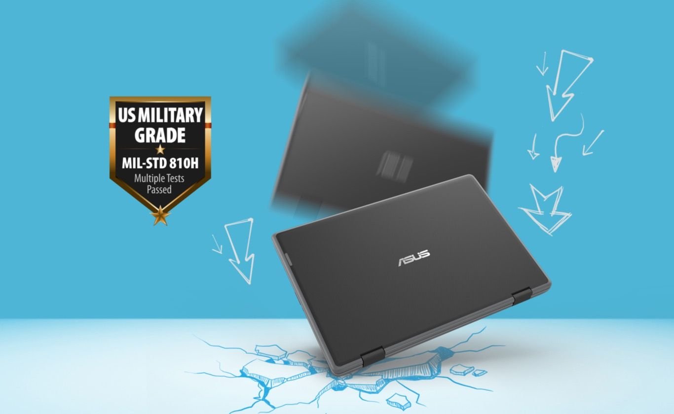 W szkolnej sali może się sporo wydarzyć, ale ASUS BR1100F jest na to gotowy! Oferuje konstrukcję o specyfikacjach przewyższających wymagające standardy wytrzymałości MIL-STD-810H stosowane przez armię USA, a dodatkowo przechodzi prawdziwe tortury, zaliczając surowe testy jakości ASUS. Jest w stanie wytrzymać okazjonalne upadki z wysokości do 120 cm – czyli większej niż wysokość standardowego biurka – a ponadto zawiasy i gniazda wejścia/wyjścia są w pełni testowane pod kątem wytrzymania obciążeń i trudów codziennego użytkowania.