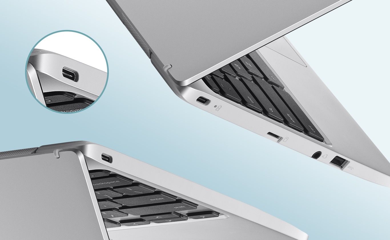 Dwa oferujące pełną funkcjonalność porty USB-C® (USB Type-C®) do podłączania dowolną stroną wtyczki umożliwiają wygodne ładowanie laptopa ASUS Chromebook CX1 oraz podłączanie do niego różnych urządzeń peryferyjnych i zewnętrznych monitorów. Gniazdo USB-C zapewnia superszybkie transmisje danych – dzięki czemu możesz przesłać plik wideo o rozmiarze 2 GB w czasie poniżej 2 sekund5! Dla maksymalnej wygody i kompatybilności ASUS Chromebook CX1 został również wyposażony w standardowe gniazda USB 3.2 oraz gniazdo na karty microSD umożliwiające zwiększenie pojemności dyskowej.