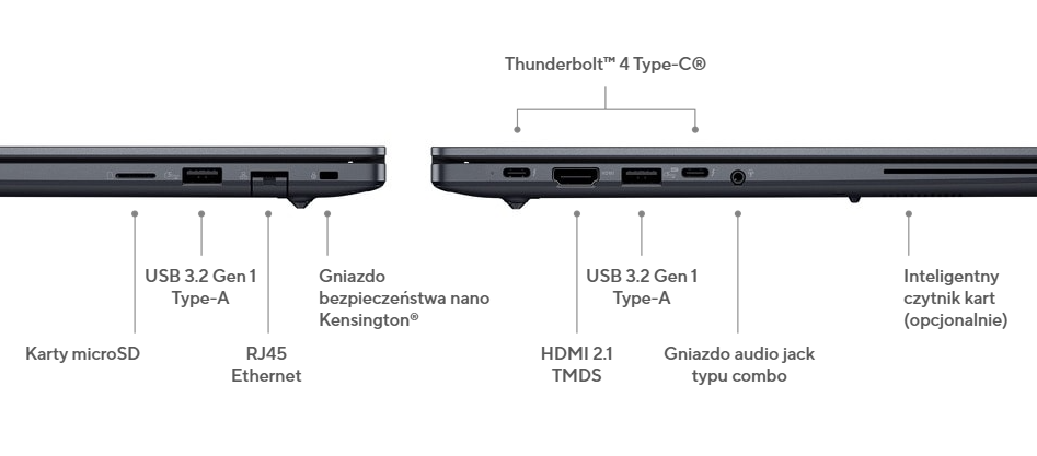 ASUS ExpertBook B5 łączy w sobie najnowszą technologię z przemyślaną, ergonomiczną konstrukcją, zapowiadając nadejście nowej generacji laptopów do zadań profesjonalnych. Jego intuicyjna przestrzeń robocza ze strategicznym układem i dużym touchpadem pozwala pracować sprawniej i szybciej, odkrywając nową erę wydajności. Oferujące pełną funkcjonalność porty Thunderbolt™ 4 Type-C umożliwiają jednoczesne dostarczanie zasilania, przesyłanie dźwięku, obrazu i danych.