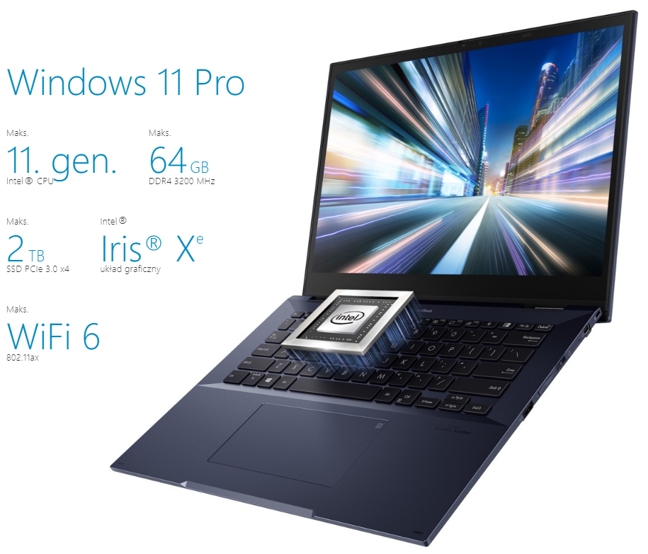 ExpertBook B7 Flip został stworzony z myślą o optymalnej produktywności w drodze i w podróży. W maksymalnej konfiguracji jest on napędzany procesorem Intel® Core™ i7 z 64 GB pamięci RAM i układem graficznym Intel Iris Xe, zapewniając szybką pracę, responsywność i wszechstronność do różnych zastosowań. Dysk zastosowaniu SSD PCIe® o pojemności do 2 TB zapewnia wydajność dyskową eliminującą czas oczekiwania, a karta Intel Wi-Fi 6 oferuje szybkość klasy gigabitowej do szybszego przesyłania dużych plików i płynniejszego przetwarzania danych w chmurze5. Laptop oferuje również do 12 godzin działania na baterię, zapewniając wystarczającą ilość energii na cały dzień pracy – i jeszcze dłużej.