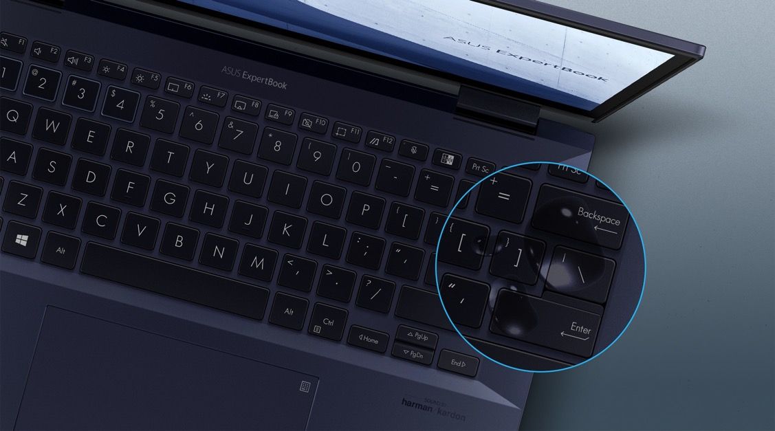 ExpertBook B7 Flip został zaprojektowany pod kątem zapewnienia bardziej wygodnego pisania i precyzyjnych reakcji. Za pomocą zawiasu ErgoLift klawiatura automatycznie podnosi się do najbardziej komfortowej pozycji do pisania. Ponadto zastosowano większe odstępy pomiędzy klawiszami oraz dłuższy czas skoku, co zapewnia bardzo responsywne i wyczuwalne reakcje i zwiększa precyzję podczas pisania.