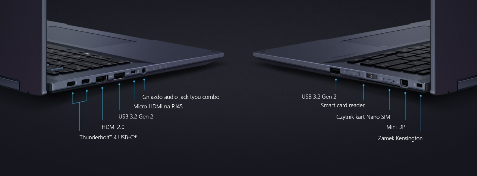 Dla użytkowników biznesowych im lepszy zestaw połączeń wejścia/wyjścia, tym lepiej, dlatego ExpertBook B7 Flip oferuje wyjątkowo wszechstronne opcje. Nowe gniazdo nano-SIM14 umożliwia łączność mobilną w standardzie 5G, a wbudowany inteligentny czytnik kart można wykorzystywać do dodatkowej kontroli tożsamości w celu zwiększenia bezpieczeństwa. Ponadto otrzymujesz dwa porty Thunderbolt ™ 4 USB-C® obsługujące transfery danych z szybkością 40 Gb/s, monitory 4K oraz technologię szybkiego ładowania. ExpertBook B7 Flip obsługuje również maksymalnie trzy zewnętrzne monitory o rozdzielczości 4K.