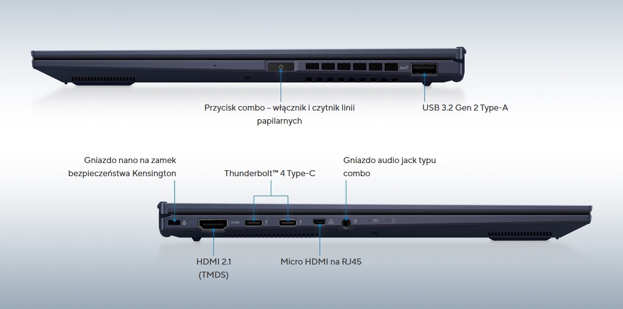 Mimo smukłego profilu, ExpertBook B9 eliminuje potrzebę noszenia uciążliwych przejściówek. Masz do dyspozycji porty Thunderbolt™ 4, USB Type-A oraz HDMI, co pozwala na błyskawiczny transfer danych i łatwe podłączenie projektorów. Laptop obsłuży do trzech monitorów 4K jednocześnie, a funkcja MAC pass-through ułatwi zarządzanie urządzeniem w firmowej infrastrukturze.