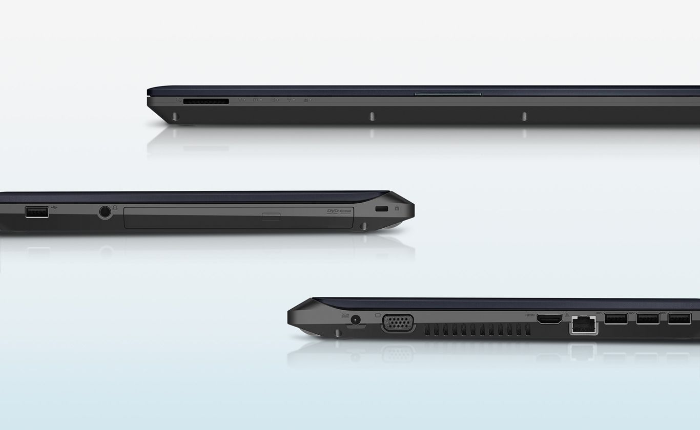 Dzięki pełnemu wyborowi portów I / O możesz bez problemu podłączyć P1440 do istniejących urządzeń. W przypadku monitorów, telewizorów lub projektorów do wyboru są porty HDMI lub VGA (D-Sub), a P1440 ma również kartę SD do transakcji online oraz trzy porty USB 3.1 Gen 1 (do 10 razy szybsze niż USB 2.0), i opcjonalny moduł napędu Super-Multi DVD.