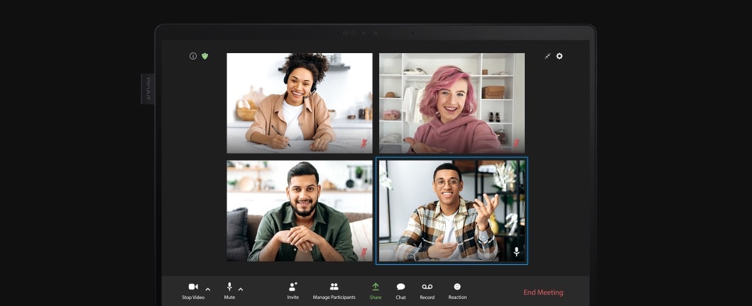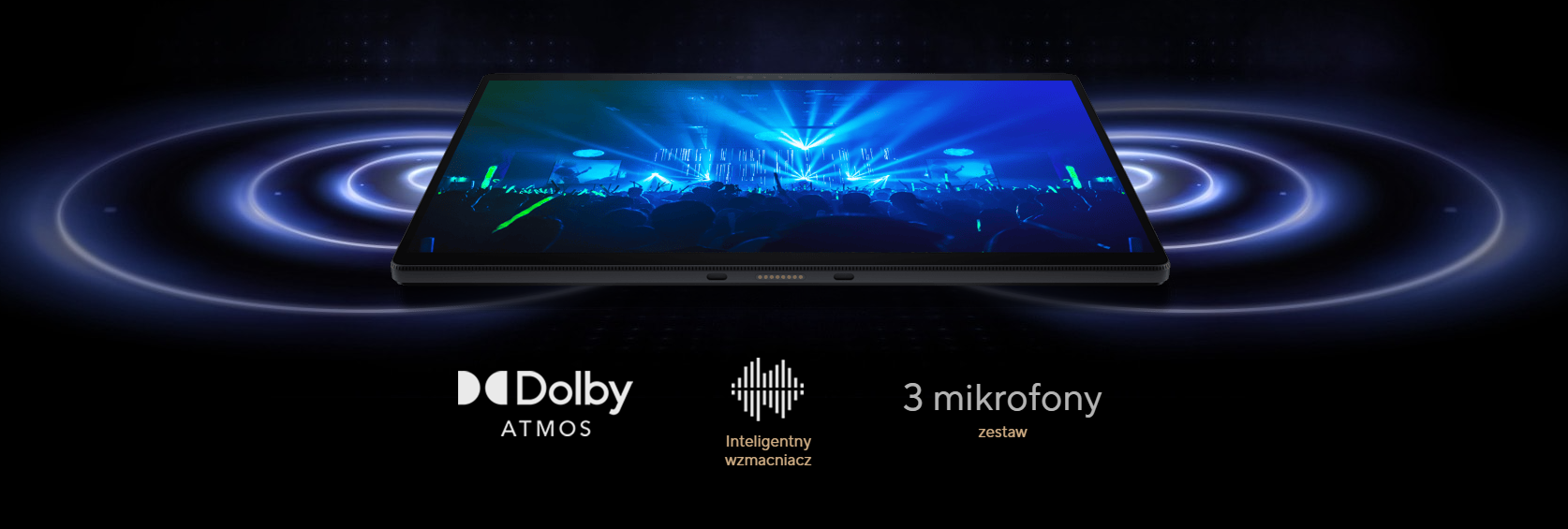 Dwa głośniki wspomagane inteligentnym wzmacniaczem zapewniają obsługę technologii Dolby Atmos, co gwarantuje doskonały dźwięk stereo. Zestaw 3 mikrofonów o wysokim współczynniku SNR i funkcja redukcji szumów z AI dla wyraźnej komunikacji głosowej w zespole – nawet w hałaśliwym otoczeniu.