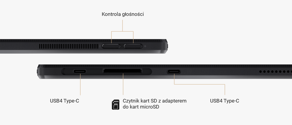 ProArt PZ13 oferuje bogate opcje połączeń. Dwa porty USB4 Type-C obsługują szybkie ładowanie, podłączanie zewnętrznych monitorów o rozdzielczości do 5K oraz transfery danych z szybkością do 40 Gb/s. Czytnik kart SD jest kompatybilny z kartami microSD, umożliwiając bezpośrednie kopiowanie/przenoszenie filmów i zdjęć z Twoich urządzeń mobilnych.
