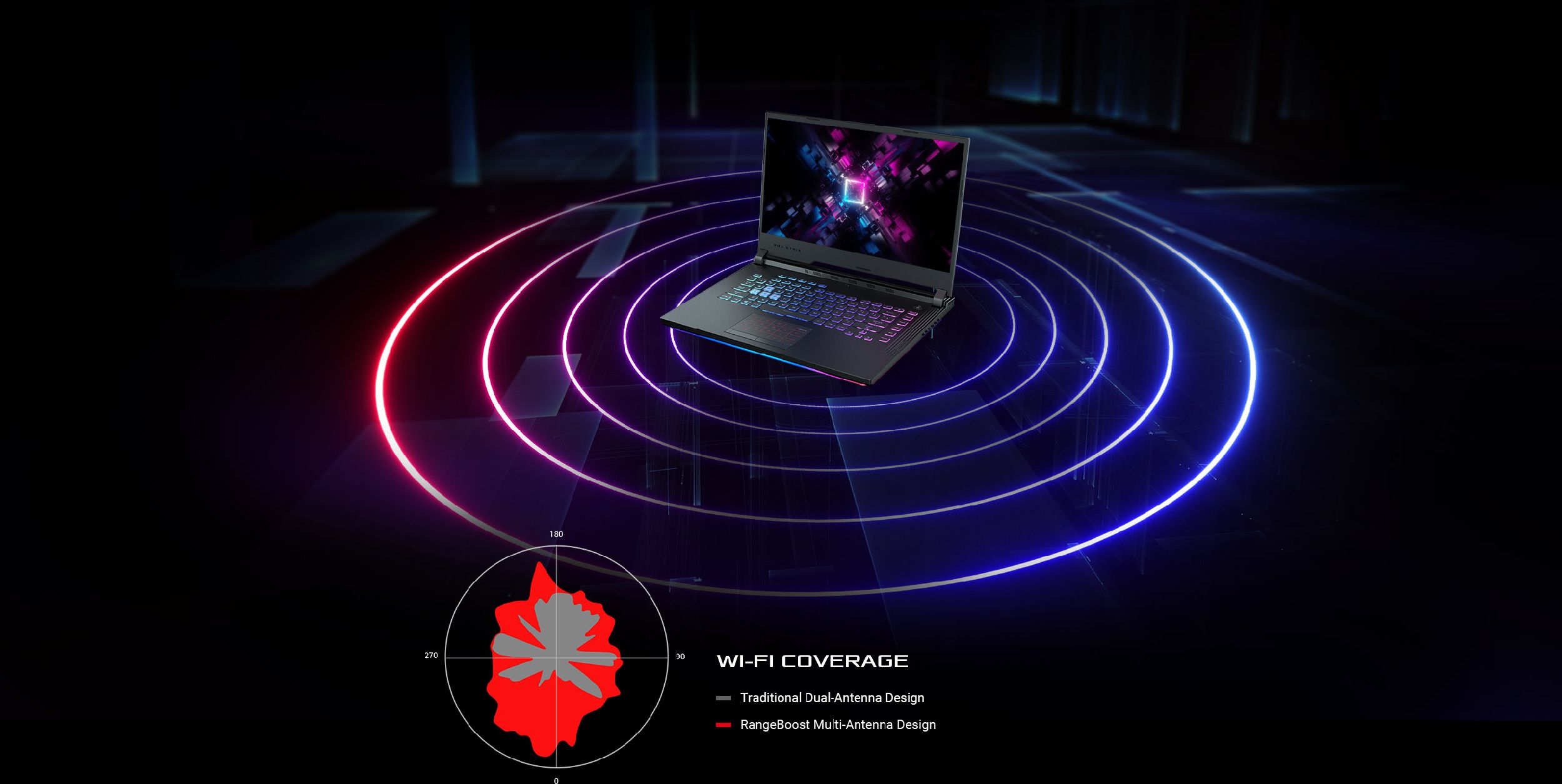 Technologia ROG RangeBoost zapewnia najbardziej stabilny sygnał Wi-Fi, jaki tylko jest możliwy. Specjalny algorytm RangeBoost ocenia siłę sygnału czterech anten wewnętrznych i wybiera najlepszą parę do wykorzystania w Twojej lokalizacji, minimalizując w ten sposób zjawisko martwych punktów i zwiększając zasięg sygnału bezprzewodowego o nawet 30%. W parze z najnowszą gigabitową kartą Wi-Fi Intel® 802.11ac (2x2), która oferuje szczytową przepustowość bezprzewodową sięgającą 1,7 Gb/s, możesz nawiązywać połączenia i grać z wysoką szybkością sieci w prawie każdym miejscu.