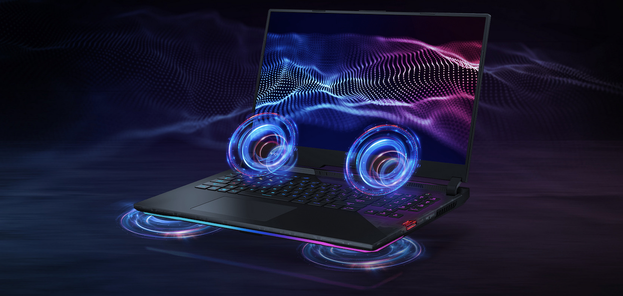 Możesz grać w trybie stealth dzięki cichszemu i bardziej efektywnemu układowi chłodzenia. Środek termoprzewodzący z ciekłego metalu na procesorze poprawia transfer ciepła dla łatwiejszego rozpraszania go. Udoskonalone wentylatory posiadają po 84 łopatki, które charakteryzują się przeprojektowaną konstrukcją zapewniającą większy przepływ powietrza przy niższym poziomie hałasu i turbulencji. Powietrze przechodzi przez cztery radiatory i otwory wylotowe z wentylatorami, co pozwala szybko odprowadzać ciepło na zewnątrz. Możesz dostosować ustawienia systemowe pod kątem poszczególnych aplikacji, aby wydajność chłodzenia i poziom hałasu były automatycznie optymalizowane do aktualnie wykonywanego zadania. Wszystkie te ulepszenia umożliwiają technologii ROG Boost przetaktowanie karty graficznej w trybie Turbo, a ponadto zapewniają wystarczającą wydajność chłodzenia do ustawiania jeszcze wyższego taktowania GPU oraz podkręcenia procesora.