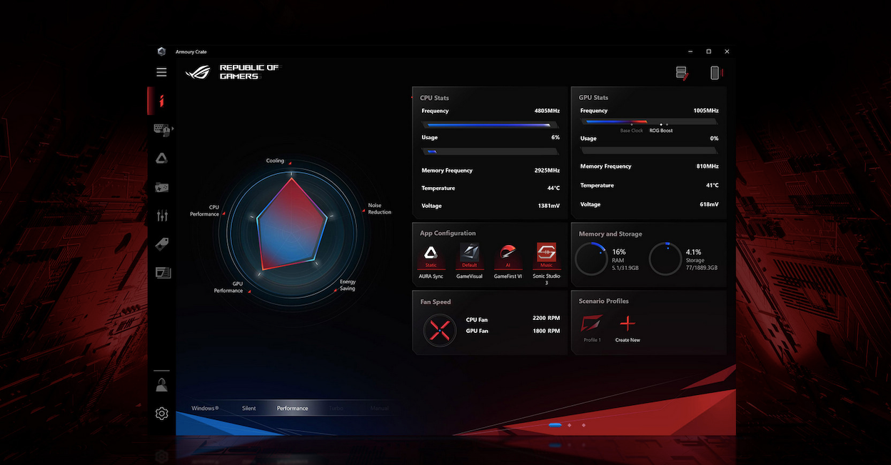 ROG Armoury Crate oferuje zarówno sterowanie pracą systemu, jak i oświetleniem, dzięki czemu najważniejsze opcje masz praktycznie zawsze pod ręką w jednej aplikacji narzędziowej. Wygodnie zdefiniujesz i spersonalizujesz profile scenariuszy gamingowych, które automatycznie dokonają określonych ustawień, kiedy uruchomisz swoje ulubione gry.