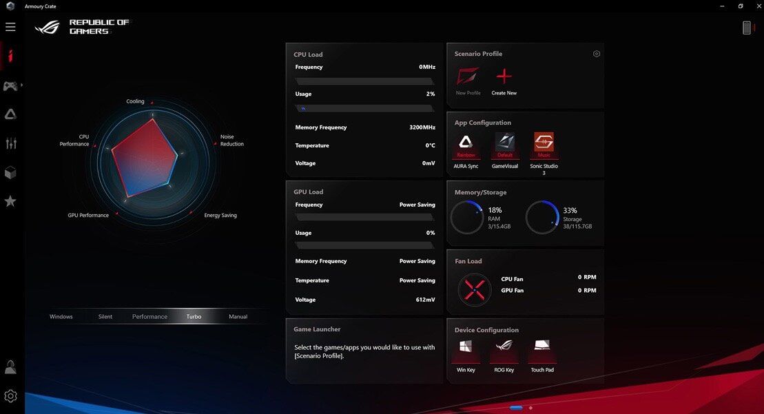 Oprogramowanie ROG Armoury Crate łączy sterowniki systemu i oświetlenia, aby zapewnić, że niezbędne ustawienia są zawsze pod ręką w jednym miejscu. Możesz łatwo zdefiniować i spersonalizować profile scenariuszy, które automatycznie zastosują zmiany po uruchomieniu ulubionych gier.