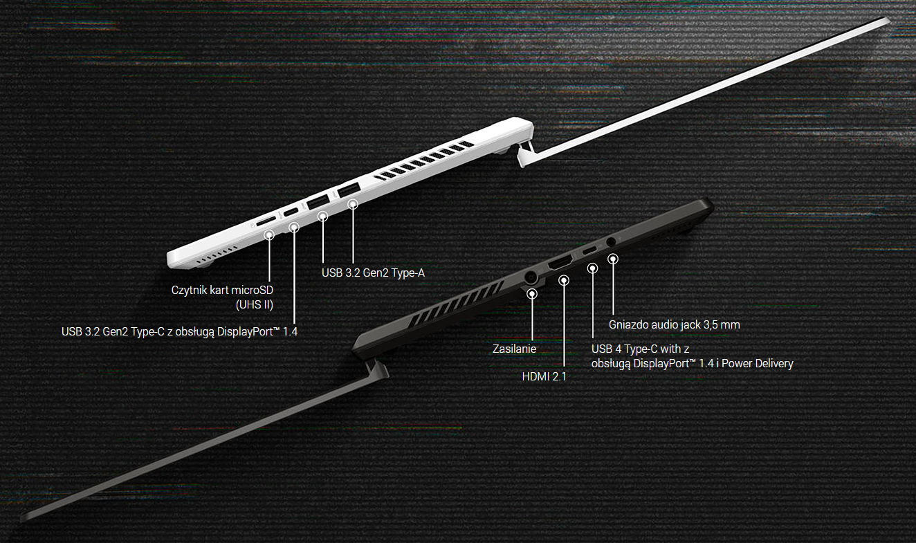 Dwa porty USB Type-C, jeden z funkcją dostarczania zasilania i obsługą DisplayPort™ 1.4, a także para portów USB 3.2 Type-A zapewniają szerokie możliwości w zakresie połączeń. Najnowszy dodatek – czytnik kart Micro SD – jest idealny dla twórców treści, którzy często wykonują transfery danych w drodze.