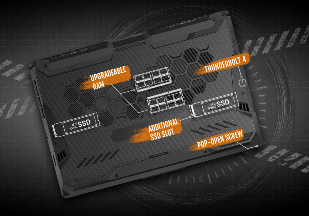 Dzięki konstrukcji ułatwiającej wymianę komponentów błyskawicznie wymienisz swoje moduły RAM i dysk SSD. Potrzebujesz tylko śrubokrętu, aby uzyskać dostęp do gniazd pamięci, przy czym specjalna śruba typu „pop-open” unosi jedną stronę panelu. TUF F15 jest również wyposażony w złącze Thunderbolt™ 4 do podłączania wszystkich najnowszych urządzeń. Skorzystaj z dużej przepustowości i podłącz zewnętrzną GPU w celu zwiększenia mocy przetwarzania grafiki do rozgrywki lub renderowania 3D, czy też podłącz maksymalnie dwa monitory 4K dla jeszcze wydajniejszej wielozadaniowości.
